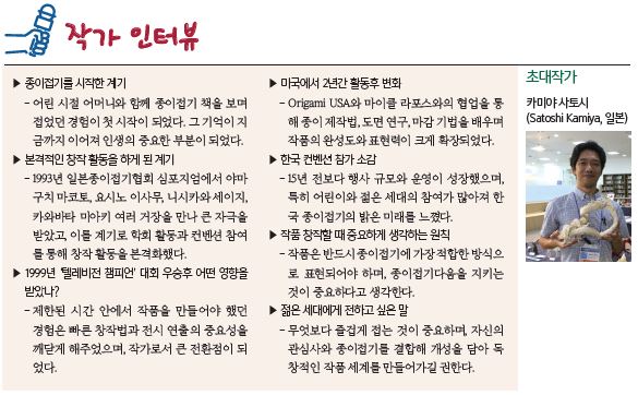이번 컨벤션에서는 일본에서 활동하고 있는 카미야 사토시, 마츠우라 에이코 2명의 종이접기 창작가를 초청하여 특별강연이 진행되며, 종이접기 교실, 작품 전시회, 친교마당등 다양한 프로그램을 통해 국내외 종이접기 창작가와 애호가들이 정보를 교류하고 친목을 다질 수 있는 기회가 될 것입니다. 종이접기 커뮤니티의 활성화를 도모하고, 종이접기 예술의 새로운 지평을 열어갈수 있는 의미 있는 이번 행사에 많은 참여 부탁드립니다.