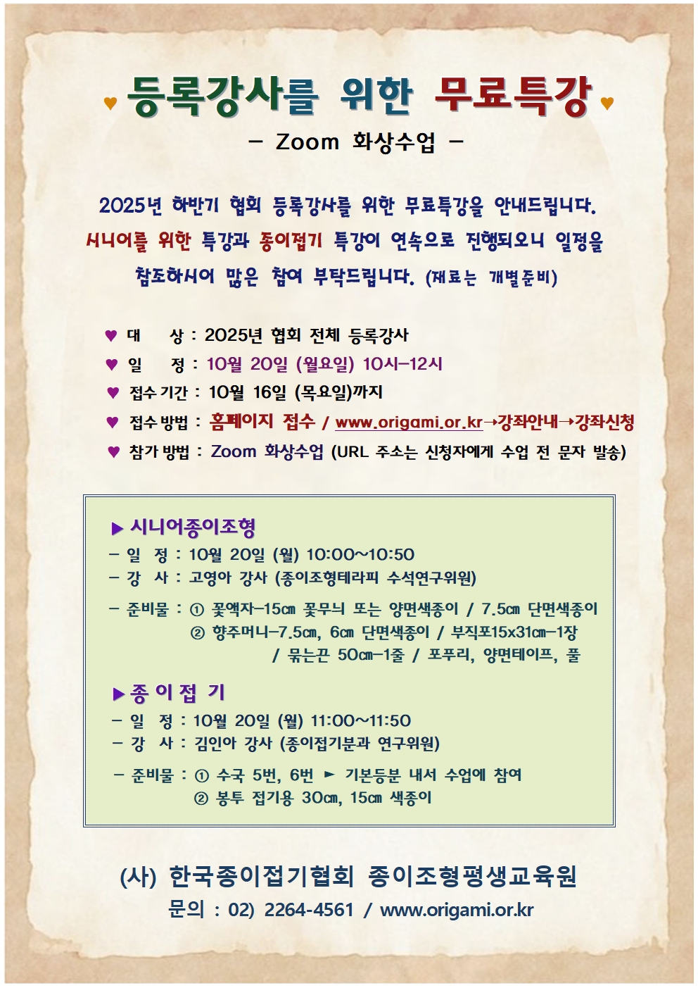 교육기간 2025-10-20 ~ 2025-10-20 교육시간 월요일 10시~12시 수강료 0원 모집기간 2025-09-22 ~ 2025-10-16 정원 100명 강좌정보 수강신청하기 강좌목록